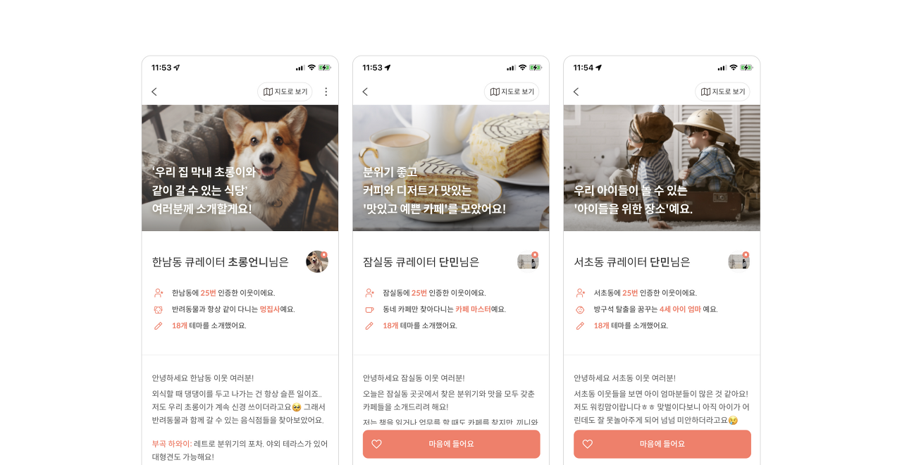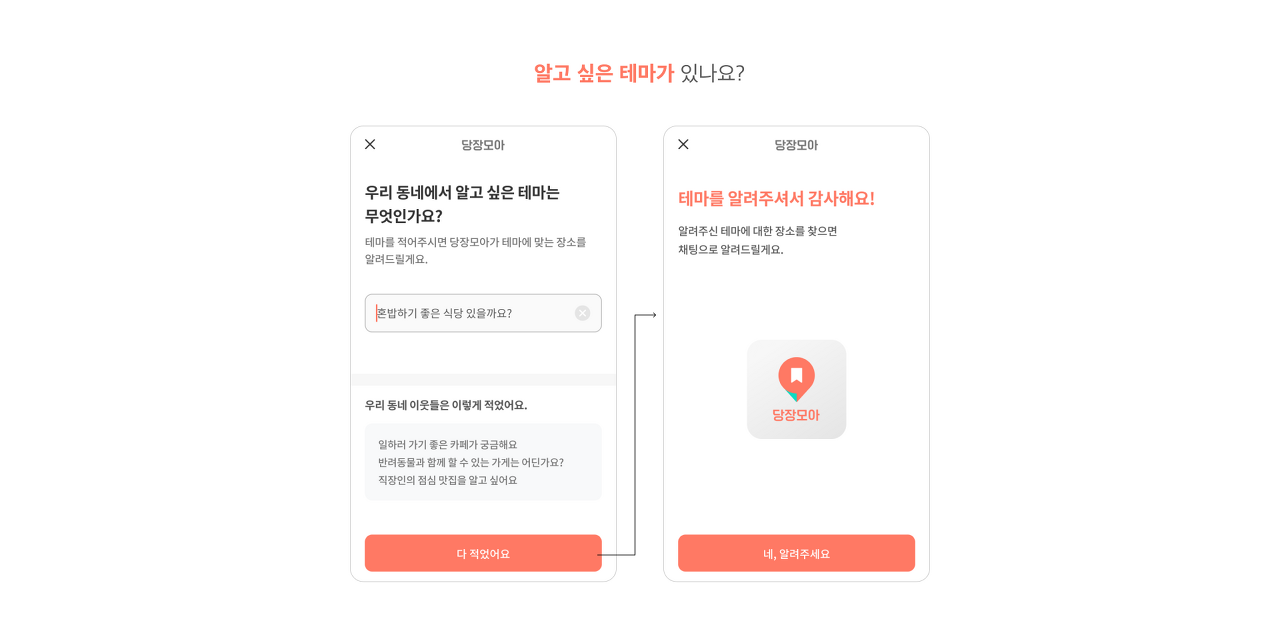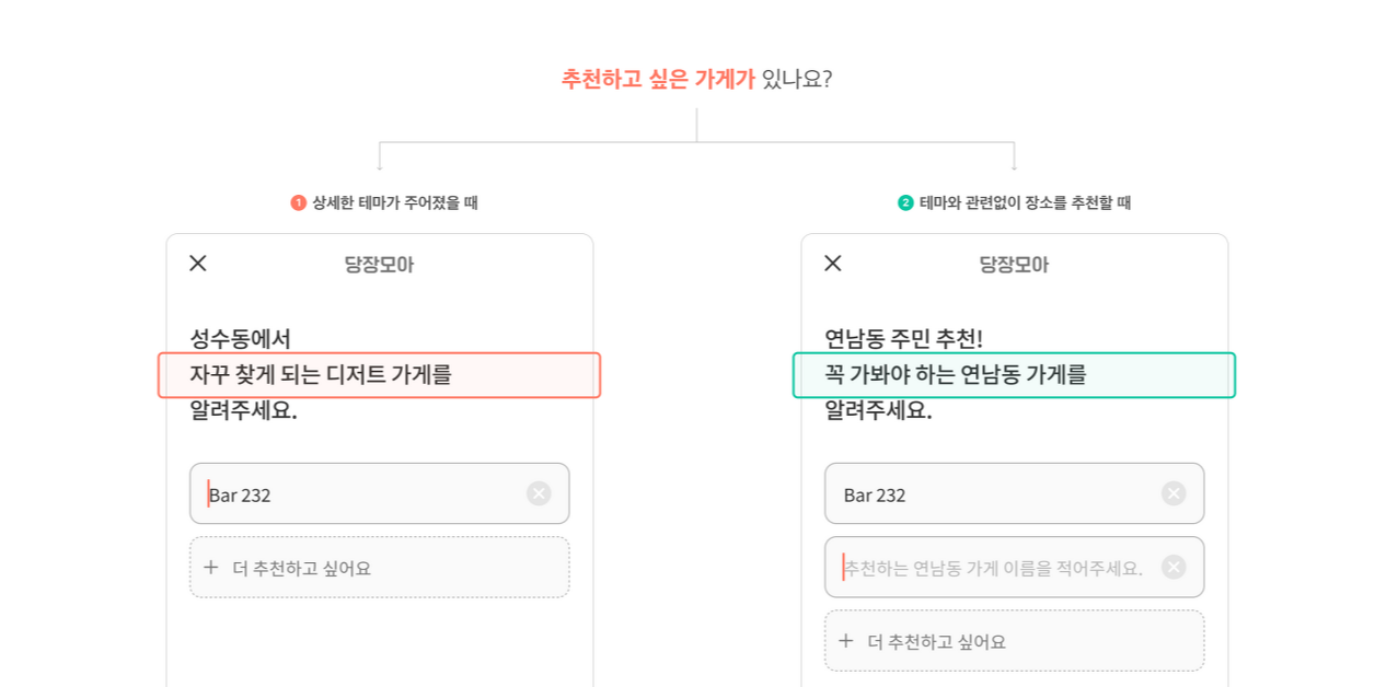 하나는 구체적인 테마가 주어졌을 때, 다른 하나는 단순히 동네 장소를 알려달라고 했을 때로 나눠서 응답을 받았다.