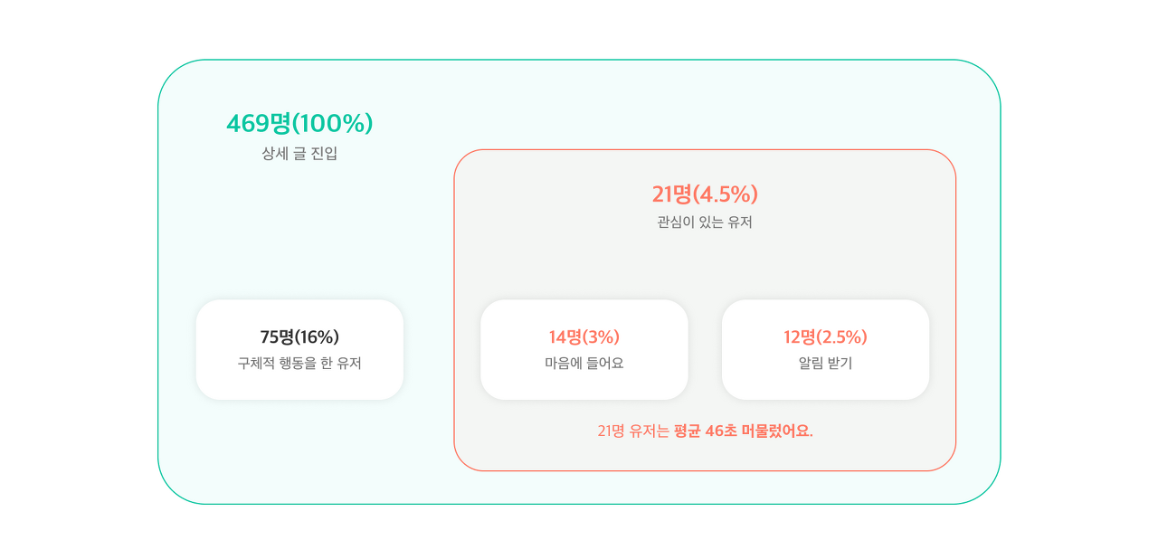 총 469명이 상세 글로 진입했고 그중 75명(16%)이 장소 카드를 누르거나 지도 버튼을 누르는 등의 구체적인 행동을 했다.