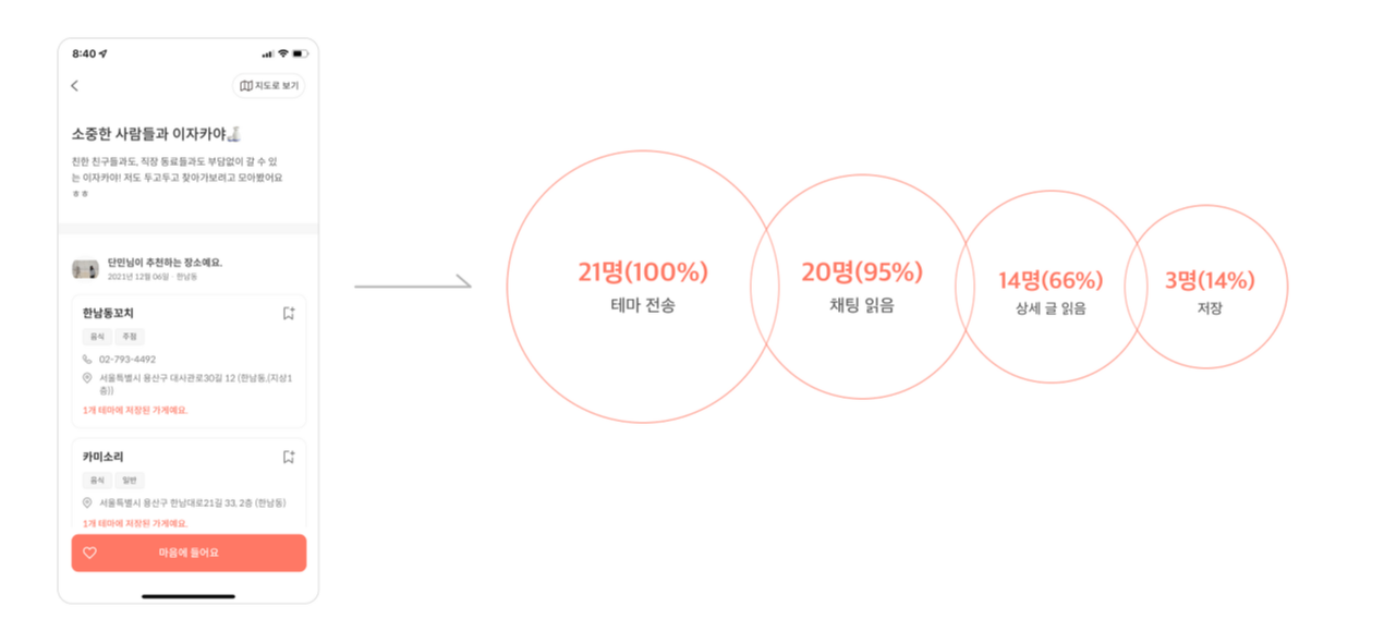 그중 20명(95%)이 채팅을 읽었고, 그중 14명(66%)이 상세 글을 읽었으며, 그중 3명(14%)이 테마 저장을 눌렀다.
