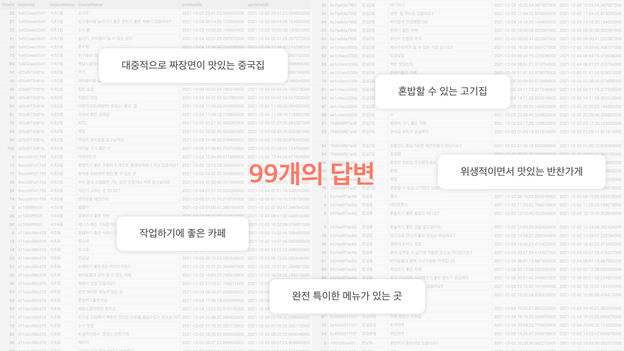 그냥 단순히 카페, 식당이 아니라 작업하기 좋은 카페, 혼밥 할 수 있는 고깃집 같이 상당히 구체적인 형식의 답변들이 대다수였다.