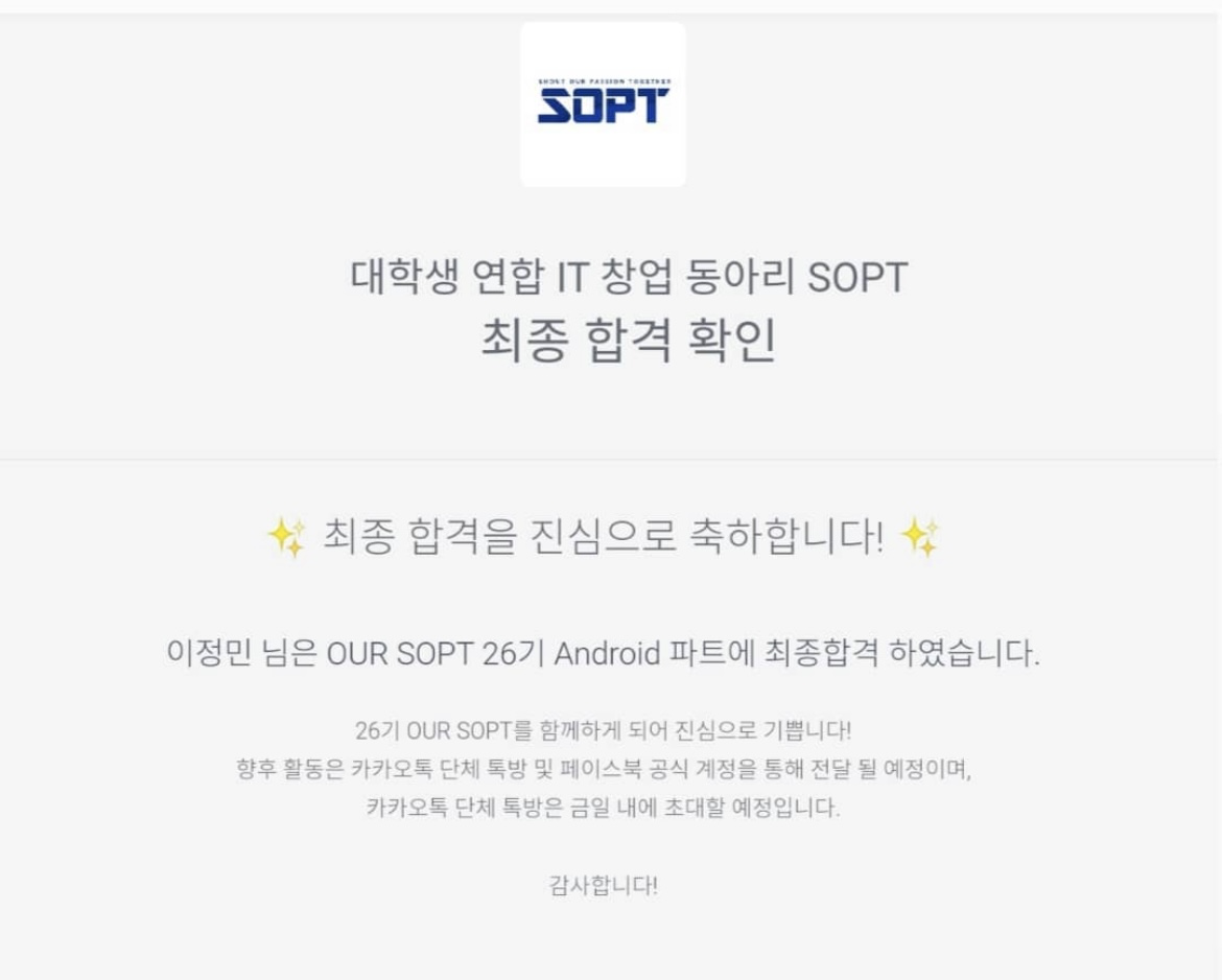 지금은 솝트에 웹 파트가 있지만, 내가 YB로 참여했던 당시에는 웹 파트가 없었다. 그래서 노드로 하는 서버 파트와 같은 클라이언트 쪽인 안드로이드 파트 중에 고민하다가 안드로이드에 지원하게 되었다. 당시 친한 친구들과 다 같이 솝트에 지원했는데, 나 혼자 붙었다. 왜 붙었는지는 모르겠지만 그만큼 간절해 보이긴 했나 보다.