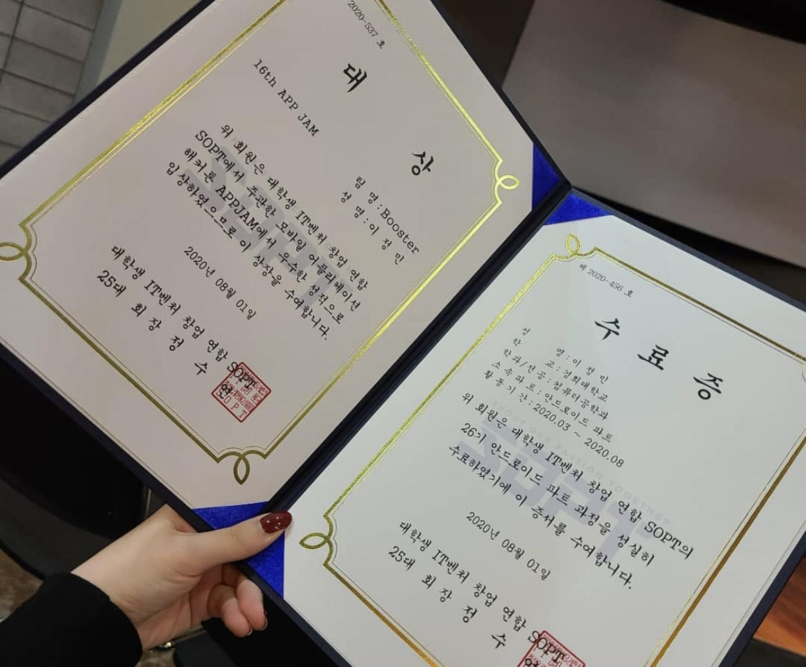 웹 프론트엔드만 하다가 안드로이드를 하려니 생각보다 고역이었다. 언어도 아예 다르고 개발 환경도 아예 다르니 도무지 적응이 되질 않았다. 다시 프론트로 돌아가고 싶은 심정뿐이었다. 그래도 많이 놀았으면 몰라, 솝트 행사는 주로 서울에서 열렸고 나는 수원 영통에 거주 중이었다. 술을 그렇게 좋아하던 내가 솝트 모임에는 가질 못했다. 그래도 이왕 시작한 거 끝까지 해보자 싶었고 솝트의 꽃, 솝트의 해커톤인 앱잼까지 참여하게 되었다.