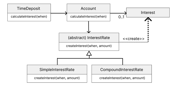 단리 이자를 계산하는 SimpleInterest와 복리 이자를 계산하는 CompoundInterest가 InterestRate를 상속받게 했다.