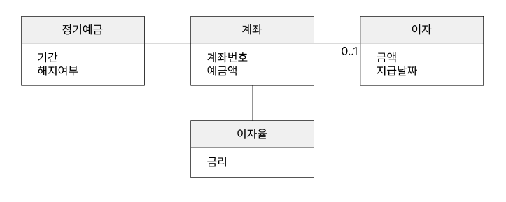 이자는 만기 시 계좌의 예금액에 따라 결정된다. 다라서 계좌와 이자 사이에는 0 또는 1의 다중성이 존재한다.